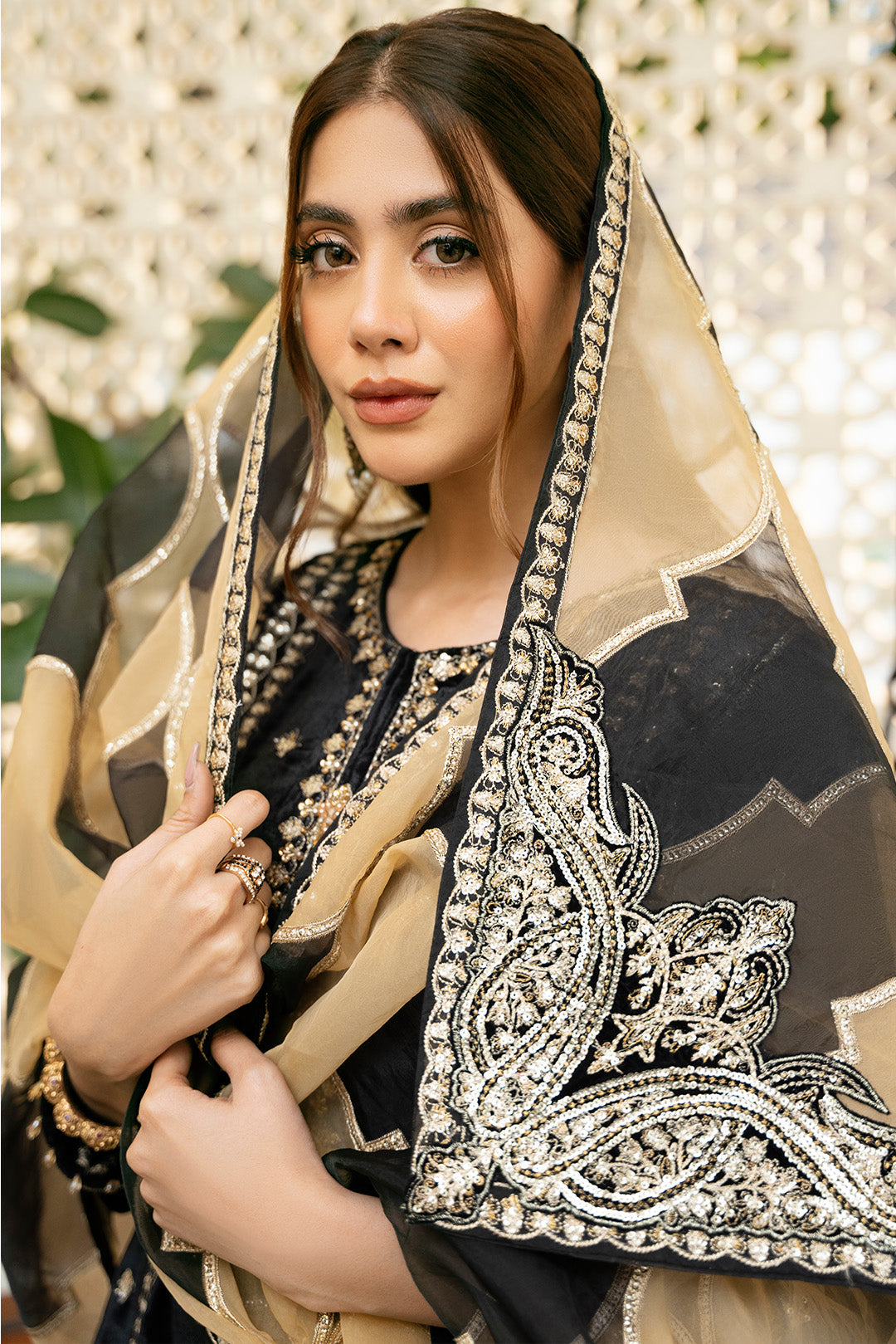 3 Piece - Embroidered Premium Velvet Shirt with Embellished Neck, Embroidered Premium Velvet Trouser and Embroidered Cutwork Two Tone Organza Dupatta