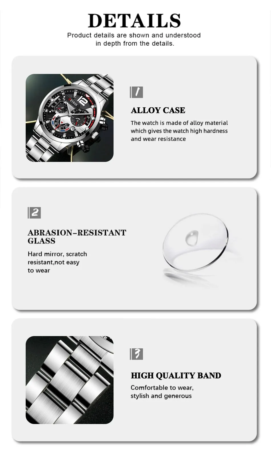 • Stainless Steel Band :The band is made of durable stainless steel, ensuring the watch will last for years to come.